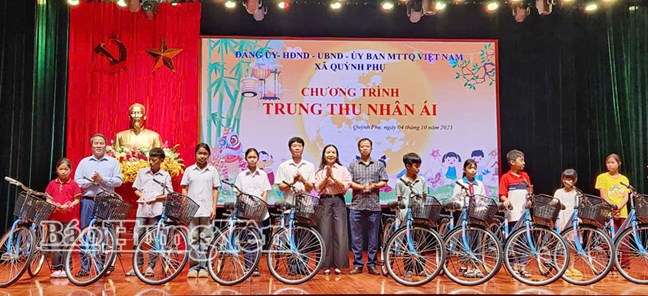 | Phó Chủ tịch Thường trực Ủy ban MTTQ Việt Nam tỉnh và lãnh đạo xã Quỳnh Phụ trao xe đạp cho học sinh nghèo vượt khó |