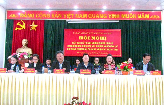 (Mặt trận) Sáng 6/3, Ban Thường trực Ủy ban Mặt trận Tổ quốc (MTTQ) Việt Nam tỉnh Lai Châu chủ trì, phối hợp với Đảng ủy, HĐND, UBND, Ủy ban Bầu cử và Ủy ban MTTQ Việt Nam xã Phong Thổ tổ chức Hội nghị tiếp xúc cử tri vận động bầu cử giữa những người ứng cử đại biểu Quốc hội khóa XVI và đại biểu HĐND các cấp nhiệm kỳ 2026 - 2031.