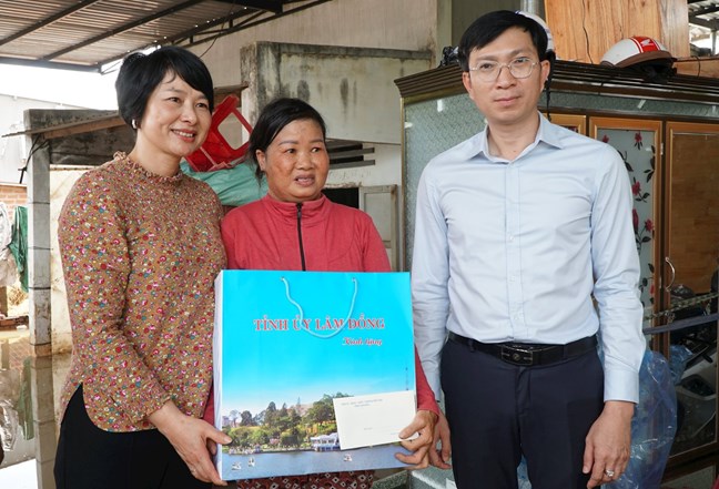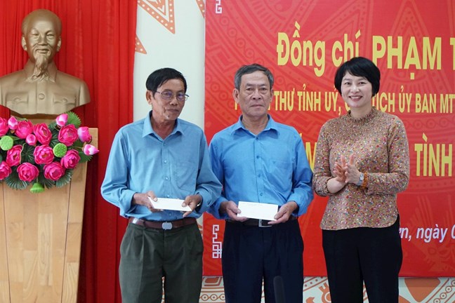 | Đồng chí Phạm Thị Phúc, Phó Bí thư Tỉnh ủy, Chủ tịch Ủy ban MTTQ Việt Nam tỉnh trao quà hỗ trợ của tỉnh cho bà Nguyễn Thị Tiềm |