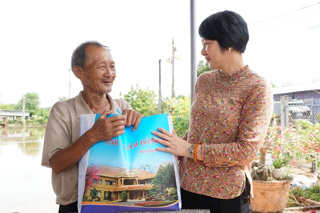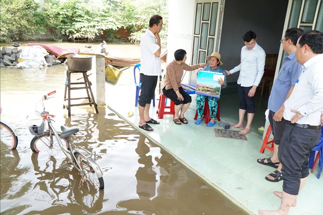 | Đồng chí Phạm Thị Phúc, Phó Bí thư Tỉnh ủy, Chủ tịch Ủy ban MTTQ Việt Nam tỉnh tặng quà cho ông Lê Văn Chung - có nhà còn bị ngập trong nước |
