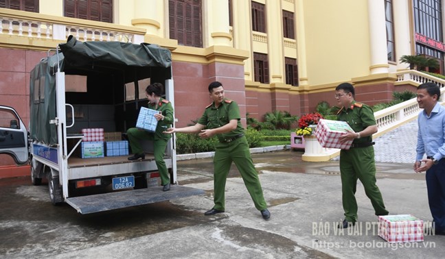 | Các cán bộ công an chuyển số vở học sinh được hỗ trợ đến các điểm trường bị ảnh hưởng bởi bão, lũ |