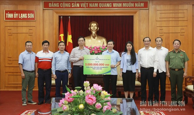 (Mặt trận) - Chiều 15/10, tại trụ sở Tỉnh ủy, đoàn công tác của Tập đoàn Công nghiệp - Năng lượng Quốc gia Việt Nam do đồng chí Trần Quang Dũng, Phó Bí thư Thường trực Đảng ủy Tập đoàn làm trưởng đoàn và đoàn công tác của Doanh nghiệp xây dựng Xuân Trường, tỉnh Ninh Bình do ông Nguyễn Văn Trường, Giám đốc Doanh nghiệp làm trưởng đoàn đến thăm, động viên và trao quà, kinh phí hỗ trợ Nhân dân tỉnh Lạng Sơn khắc phục thiệt hại do cơn bão số 11 gây ra.