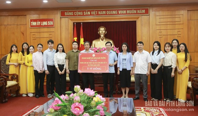 | Đoàn công tác của Doanh nghiệp xây dựng Xuân Trường trao biển ủng hộ kinh phí hỗ trợ người dân trên địa bàn tỉnh Lạng Sơn khắc phục hậu quả thiên tai |