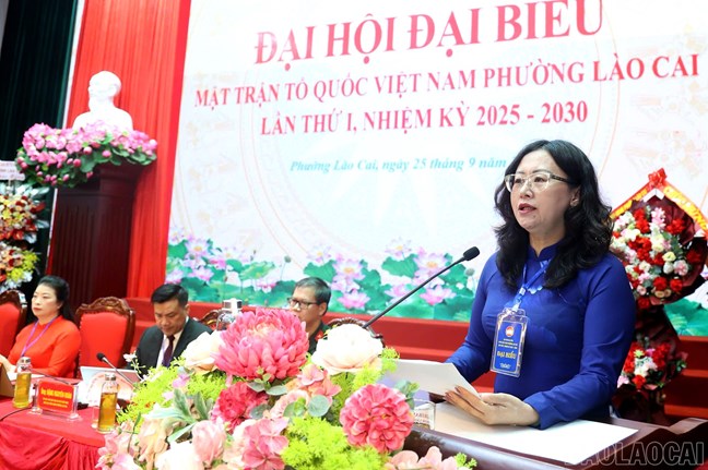 (Mặt trận) - Chiều 25/9, đồng chí Giàng Thị Dung - Phó Bí thư Tỉnh ủy, Chủ tịch Ủy ban Mặt trận Tổ quốc Việt Nam tỉnh dự và phát biểu chỉ đạo tại Đại hội đại biểu Mặt trận Tổ quốc Việt Nam phường Lào Cai lần thứ I, nhiệm kỳ 2025 - 2030.
