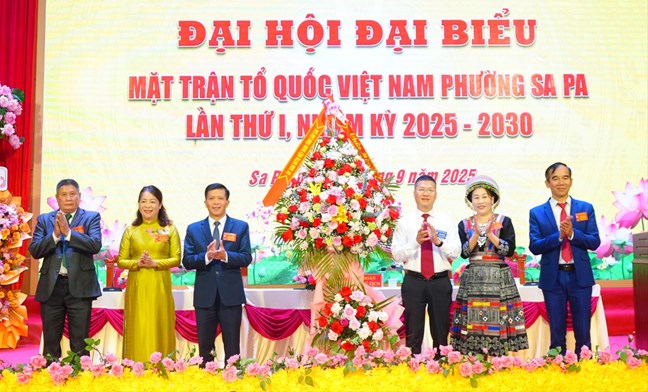 | Ủy Ban MTTQ Việt Nam tỉnh và lãnh đạo phường Sa Pa tặng hoa chúc mừng đại hội |
