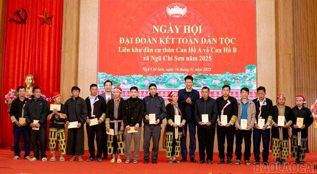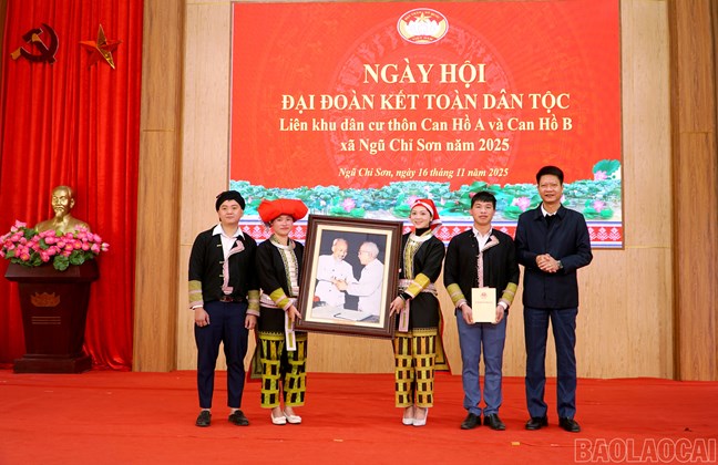 | Ông Hoàng Giang - Phó Bí thư Thường trực Tỉnh ủy tặng quà Tổ dân phố Nậm Tọ nhân Ngày hội Đại đoàn kết |