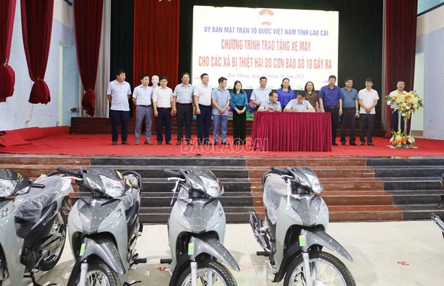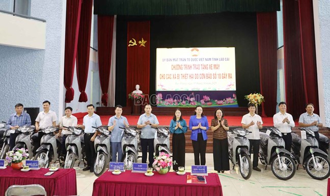 (Mặt trận) - Sáng 5/10, tại xã Bảo Thắng, đồng chí Giàng Thị Dung - Phó Bí thư Tỉnh ủy, Chủ tịch Ủy ban MTTQ Việt Nam tỉnh Lào Cai trao tặng xe máy hỗ trợ 12 xã bị thiệt hại nặng do hoàn lưu bão số 10.