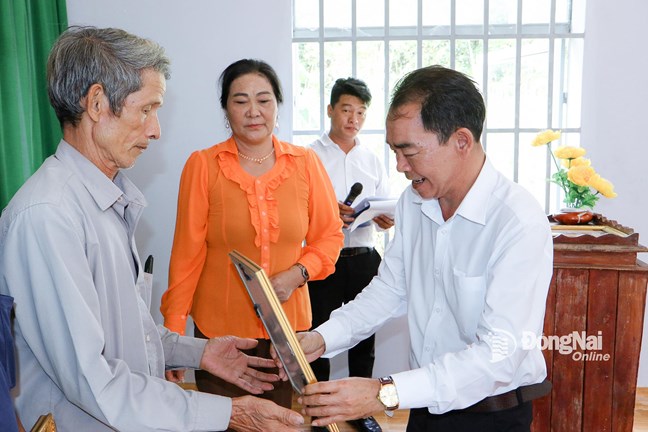 | Bí thư Đảng ủy, Chủ tịch HĐND xã Đak Lua Phan Văn Tùng trao quyết định bàn giao nhà kiên cố cho người dân nhân dịp chào mừng Đại hội Đại biểu MTTQ Việt Nam xã lần thứ I, nhiệm kỳ 2025-2030. Ảnh: Văn Truyên |