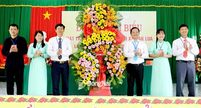 | Ủy viên Ban Thường vụ Tỉnh ủy, Phó Chủ tịch Thường trực Ủy ban MTTQ Việt Nam tỉnh Đồng Nai Hà Anh Dũng tặng hoa chúc mừng các ủy viên Ủy ban MTTQ Việt Nam xã Đak Lua nhiệm kỳ 2025-2030. Ảnh: Văn Truyên |
