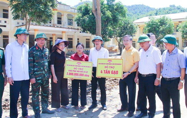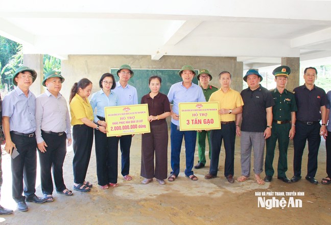 | Đồng chí Võ Thị Minh Sinh - Phó Bí thư Tỉnh ủy, Chủ tịch Ủy ban Mặt trận Tổ quốc Việt Nam tỉnh, Trưởng đoàn Đại biểu Quốc hội tỉnh và đoàn công tác trao hỗ trợ của tỉnh cho xã Yên Na 2 tỷ đồng và 3 tấn gạo khắc phục hậu quả mưa bão. Ảnh: Mai Hoa |