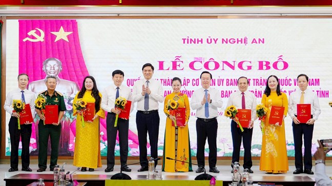 Chiều 30/6, Ban Chấp hành Đảng bộ tỉnh Nghệ An tổ chức lễ công bố quyết định thành lập cơ quan Ủy ban Mặt trận Tổ quốc tỉnh và công nhận Ban Thường trực Ủy ban Mặt trận Tổ quốc tỉnh Nghệ An.