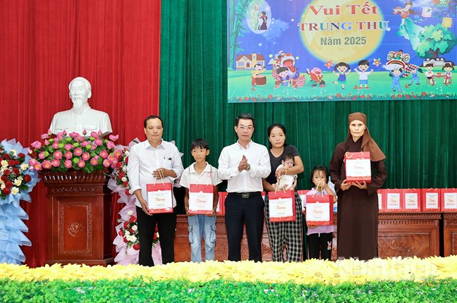 | Đồng chí Nguyễn Hoàng Hà, Ủy viên Ban Thường vụ Tỉnh ủy, Phó Chủ tịch thường trực Ủy Ban MTTQ Việt Nam tỉnh tặng quà Tết Trung thu cho các cháu thiếu niên, nhi đồng xã Yên Cường có hoàn cảnh đặc biệt khó khăn |