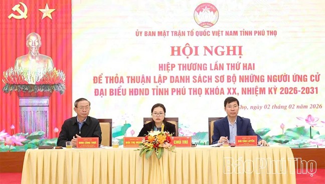 (Mặt trận) Ngày 2/2, Ban Thường trực Ủy ban Mặt trận Tổ quốc (MTTQ) tỉnh Phú Thọ tổ chức Hội nghị hiệp thương lần thứ hai để thỏa thuận lập danh sách sơ bộ những người ứng cử đại biểu Quốc hội khóa XVI, đại biểu HĐND tỉnh khóa XX, nhiệm kỳ 2026-2031.