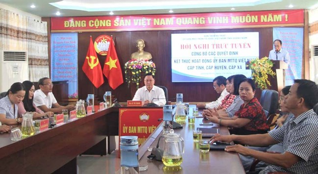 (Mặt trận) -Sáng 24/6, Ủy ban Mặt trận Tổ quốc Việt Nam tỉnh Quảng Nam tổ chức hội nghị trực tuyến công bố các quyết định kết thúc hoạt động Ủy ban Mặt trận Tổ quốc Việt Nam cấp tỉnh, cấp huyện, cấp xã.