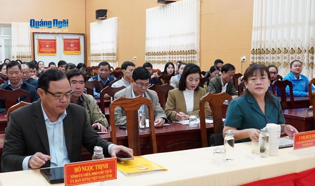 Tham dự Hội nghị có Ủy viên Ban Thường vụ Tỉnh ủy, Phó Chủ tịch Thường trực Ủy ban MTTQ Việt Nam tỉnh Quảng Ngãi Y Thị Bích Thọ cùng các Phó Chủ tịch Ủy ban MTTQ Việt Nam tỉnh Quảng Ngãi. Hội nghị được tổ chức trực tiếp tại Hội trường Ủy ban MTTQ Việt Nam tỉnh Quảng Ngãi kết nối đến 96 xã, phường, đặc khu.