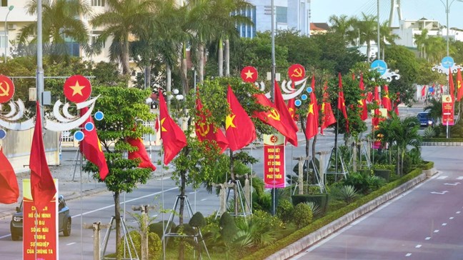 Dọc các tuyến đường chính trên địa bàn trung tâm phường Đồng Hới, tỉnh Quảng Trị được bố trí băng rôn, khẩu hiệu chào mừng Đại hội XIV của Đảng - Ảnh: H.TR