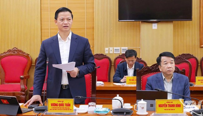 | Đồng chí Vương Quốc Tuấn, Ủy viên Ban Chấp hành Trung ương Đảng, Phó Bí thư Tỉnh ủy, Chủ tịch UBND tỉnh, Phó Trưởng Ban Chỉ đạo bầu cử tỉnh, Phó Chủ tịch Thường trực Ủy ban bầu cử tỉnh phát biểu tại Hội nghị. |