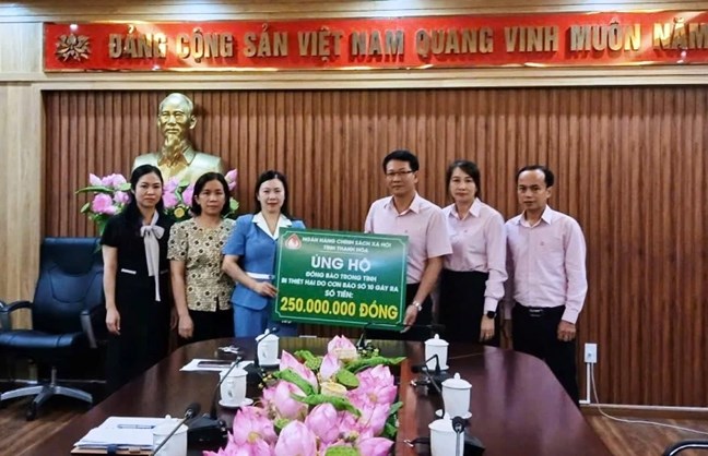 | Đại diện lãnh đạo Ngân hàng Chính sách Xã hội tỉnh Thanh Hóa trao 250 triệu đồng ủng hộ người dân bị thiệt hại do bão số 10 |