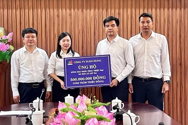 | Đại diện Công ty Xuân Hưng trao 500 triệu đồng ủng hộ người dân bị thiệt hại do bão lũ gây ra |