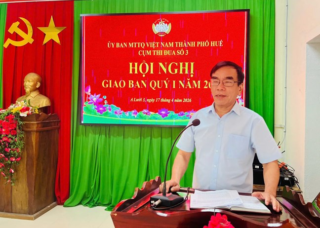 (Mặt trận) - Sáng ngày 17/4, tại Hội trường Ủy ban Mặt trận Tổ quốc Việt Nam xã A Lưới 3 (thành phố Huế), Cụm thi đua số 3 gồm 10 xã, phường gồm: phường Phong Thái, phường Phong Điền, phường Hương Trà, phường Kim Trà, xã Bình Điền và các xã A Lưới 1, 2, 3, 4, 5 đã tổ chức Hội nghị giao ban công tác Mặt trận Quý I năm 2026.