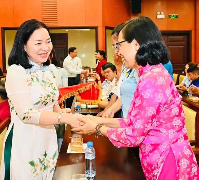 | Bà Trương Thị Bích Hạnh, Ủy viên Ban Thường vụ Thành ủy, Phó Chủ tịch Thường trực Ủy ban MTTQ Việt Nam TPHCM trao thiệp chúc tết đến các đại biểu. Ảnh: VIỆT DŨNG |