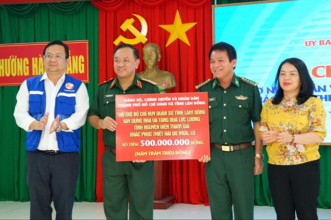 | Trao hỗ trợ Bộ Chỉ huy Quân sự tỉnh Lâm Đồng xây dựng nhà và tặng quà lực lượng tình nguyện viên tham gia khắc phục thiệt hại do mưa lũ |