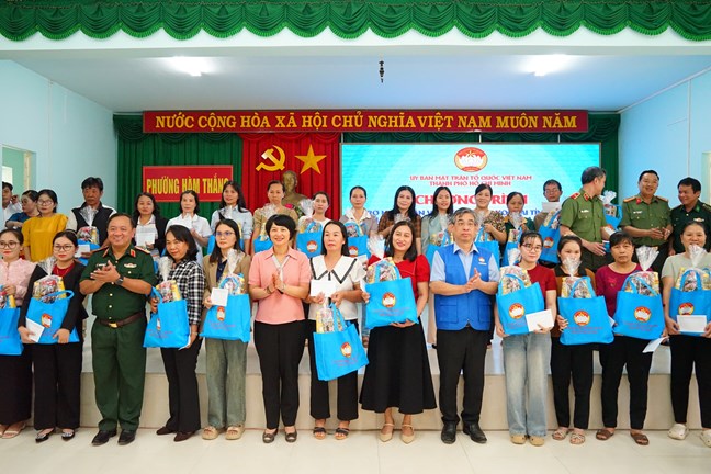 | Ông Nguyễn Phước Lộc, Phó Bí thư Thành ủy, Chủ tịch Ủy ban MTTQ Việt Nam TP. Hồ Chí Minh trao hỗ trợ cho gia đình cán bộ, chiến sĩ, dân quân tự vệ bị ảnh hưởng mưa lũ |