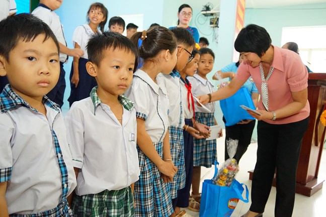 | Bà Phạm Thị Phúc, Phó Bí thư Tỉnh ủy, Chủ tịch Ủy ban MTTQ Việt Nam tỉnh tặng quà cho các em học sinh Trường Tiểu học ở Hàm Thắng (Lâm Đồng) |