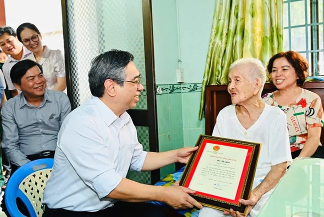 | Ông Nguyễn Phước Lộc, Ủy viên Trung ương Đảng, Phó Bí thư Thành ủy, Chủ tịch Ủy ban MTTQ Việt Nam TPHCM trao thiếp mừng thọ 100 tuổi và quà của Chủ tịch nước Lương Cường đến cụ Hồ Thị Quới. Ảnh: VIỆT DŨNG |