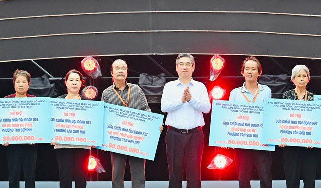 Ông Nguyễn Phước Lộc, Ủy viên Trung ương Đảng, Phó Bí thư Thành ủy, Chủ tịch Ủy ban MTTQ Việt Nam TPHCM trao bảng tượng trưng kinh phí hỗ trợ xây dựng, sửa chữa nhà cho các hộ dân. Ảnh: Việt Dũng