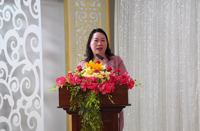 Bà Nguyễn Thị Ái Vân, UVTV Thành ủy, Bí thư Đảng ủy, Phó Chủ tịch Thường trực Ủy ban MTTQ Việt Nam thành phố phát biểu tại Hội nghị
