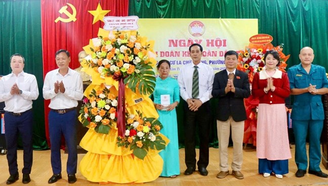 | Ông Phan Thắng - UVTV Thành ủy, Chỉ huy trưởng Bộ CHQS thành phố tặng hoa chúc mừng tổ dân phố La Chữ Trung, phường Kim Trà |