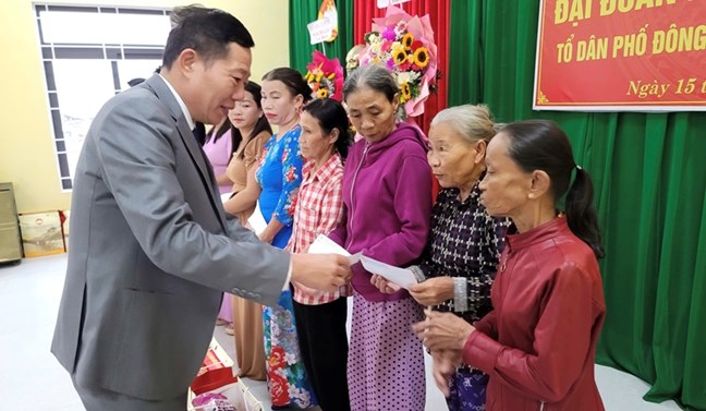 | Phó Chủ tịch HĐND thành phố Hà Văn Tuấn trao quà cho người dân tổ dân phố Đông Phú, phường Phong Dinh |