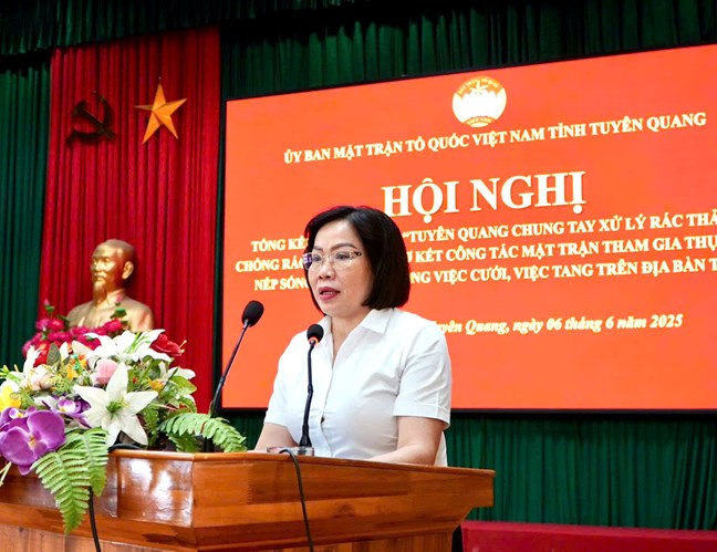 Phát biểu tại Hội nghị, đồng chí Tăng Thị Dương, Tỉnh ủy viên, Phó Chủ tịch Thường trực Ủy ban MTTQ Việt Nam tỉnh Tuyên Quang ghi nhận và biểu dương những kết quả mà MTTQ Việt Nam các cấp và các tổ chức thành viên đã đạt được trong triển khai thực hiện Phong trào "Tuyên Quang chung tay xử lý rác thải và chống rác thải nhựa" và việc thực hiện nếp sống văn minh trong việc cưới, việc tang trong thời gian qua. Đồng chí Phó Chủ tịch Thường trực Ủy ban MTTQ Việt Nam tỉnh Tăng Thị Dương khẳng định, Phong trào “Tuyên Quang chung tay xử lý rác thải và chống rác thải nhựa"; việc thực hiện nếp sống văn minh trong việc cưới, việc tang đã đạt được những kết quả tích cực, có nhiều mô hình hay, cách làm hiệu quả. Tuy nhiên còn một số hạn chế như: nhận thức của một bộ phận người dân trong công tác bảo vệ môi trường, thực hiện nếp sống văn minh trong việc cưới, việc tang chuyển biến chậm; việc thu gom, phân loại, xử lý rác thải chưa đồng bộ. Đồng chí đề nghị, MTTQ Việt Nam các cấp và các tổ chức thành viên trong tỉnh lựa chọn cách làm phù hợp để tiếp tục triển khai thực hiện Phong trào “Tuyên Quang chung tay xử lý rác thải và chống rác thải nhựa"; việc thực hiện nếp sống văn minh trong việc cưới, việc tang trong thời gian tiếp theo đảm bảo hiệu quả, thiết thực, ngày càng thu hút đông đảo Nhân dân tham gia; duy trì, nâng cao chất lượng hoạt động của các tổ tự quản ở khu dân cư về bảo vệ môi trường; phát huy vai trò của người uy tín, người thực hành tín ngưỡng tâm linh và các chức sắc, chức việc tham gia thực hiện nếp sống văn minh trong việc cưới, việc tang.