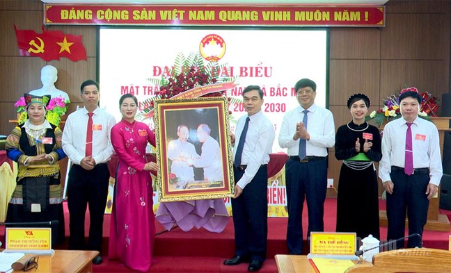 | Phó Bí thư Tỉnh ủy, Chủ tịch Ủy ban MTTQ Việt Nam tỉnh Tuyên Quang Ma Thế Hồng tặng bức ảnh Chủ tịch Hồ Chí Minh và Bác Tôn Đức Thắng cho Đại hội. |