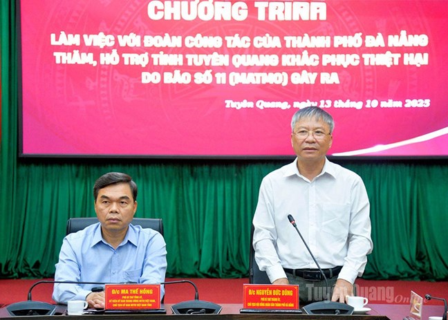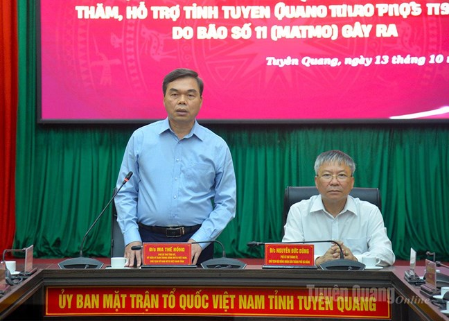 (Mặt trận) - Sáng 13-10, đồng chí Ma Thế Hồng, Phó Bí thư Tỉnh ủy, Chủ tịch Ủy ban Mặt trận Tổ quốc (MTTQ) Việt Nam tỉnh Tuyên Quang đã tiếp và làm việc với Đoàn công tác của thành phố Đà Nẵng thăm, hỗ trợ tỉnh khắc phục thiệt hại do bão số 11 (Matmo) gây ra.