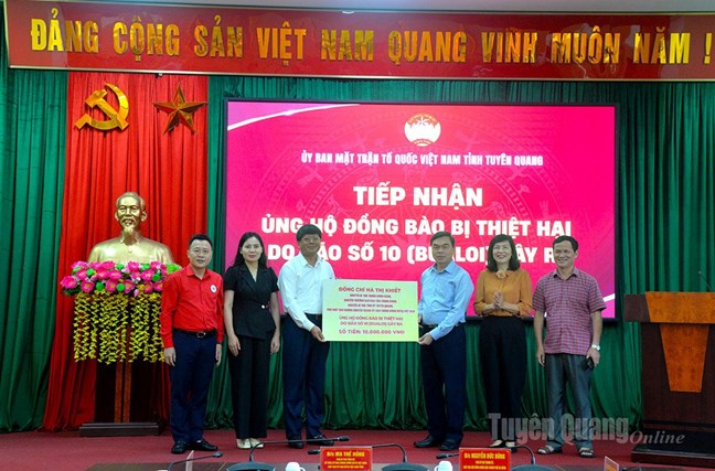 Cũng trong sáng nay, Phó Bí thư Tỉnh ủy, Chủ tịch Ủy ban MTTQ Việt Nam tỉnh Ma Thế Hồng và các đồng chí lãnh đạo tỉnh đã tiếp nhận số tiền hỗ trợ 10 triệu đồng ủng hộ bão lũ của đồng chí Hà Thị Khiết, nguyên Bí thư Trung ương Đảng, nguyên Trưởng Ban Dân vận Trung ương, nguyên Bí thư Tỉnh ủy Tuyên Quang, Phó Chủ tịch không chuyên trách Ủy ban Trung ương MTTQ Việt Nam.