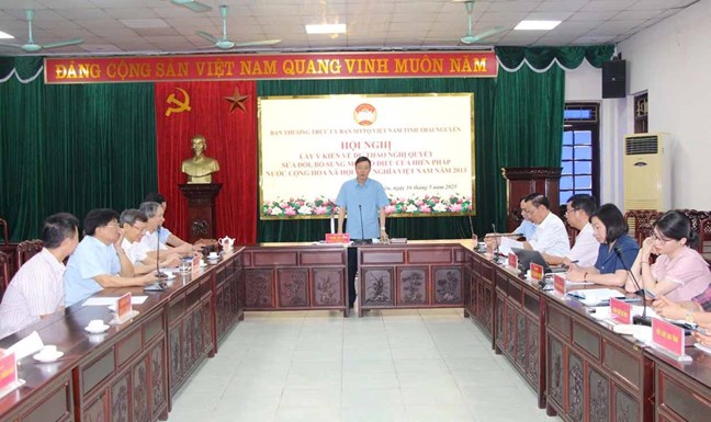 (Mặt trận) -Ngày 16/5, Ủy ban Mặt trận Tổ quốc Việt Nam tỉnh Thái Nguyên tổ chức hội nghị lấy ý kiến về dự thảo Nghị quyết sửa đổi, bổ sung một số điều của Hiến pháp nước CHXHCN Việt Nam năm 2013.