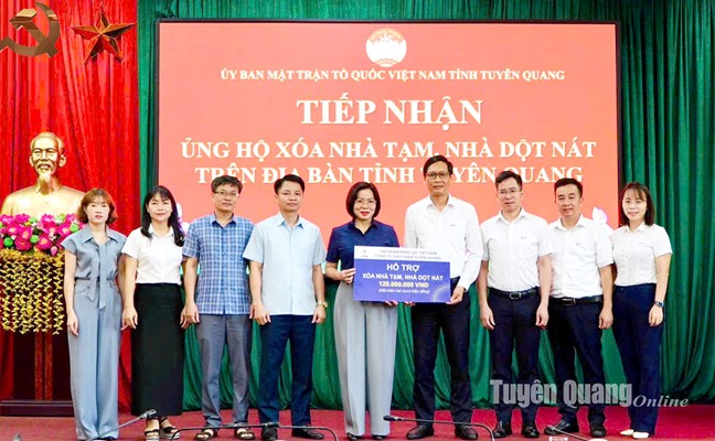 (Mặt trận) -Sáng 2/6, tại trụ sở Ủy ban MTTQ Việt Nam tỉnh Tuyên Quang, Công ty Thủy điện Tuyên Quang đã trao tặng 120 triệu đồng hỗ trợ xoá nhà tạm, nhà dột nát trên địa bàn tỉnh. Đây là hoạt động thiết thực của công ty hưởng ứng phong trào thi đua “Tuyên Quang chung tay xóa nhà tạm, nhà dột nát trên địa bàn tỉnh Tuyên Quang trong năm 2025”.