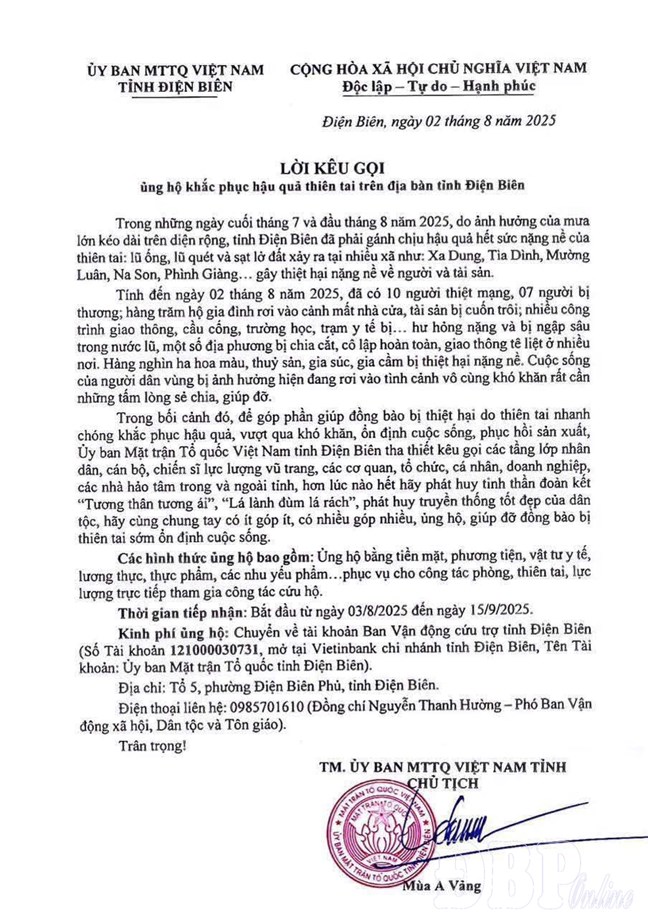“Hiện nay, bà con nhân dân vùng thiệt hại đối mặt với nhiều khó khăn, thiếu thốn. Trong đó, 2 nhu cầu thiết yếu trước mắt là quần áo và lương thực thực phẩm. Về lâu dài, cũng cần nguồn kinh phí rất lớn để khắc phục, hỗ trợ nhân dân ổn định cuộc sống. Do vậy, đồng bào, nhân dân Điện Biên rất cần hơn nữa các tấm lòng hảo tâm, sự chung tay của cả nước, để hỗ trợ nhân dân địa phương vượt qua khó khăn”.