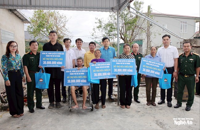 Đặc biệt, đoàn công tác trao hỗ trợ 60 triệu đồng cho gia đình bà Trịnh Thị Xử (xóm Hưng Phúc 1, xã Lam Thành) - gia đình có nhà bị sập hoàn toàn sau bão số 10.