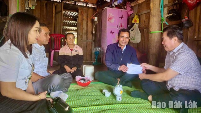 Đồng chí Trần Hữu Thế, Phó Chủ tịch Thường trực Ủy ban Mặt trận Tổ quốc Việt Nam tỉnh Đắk Lắk thăm, tặng quà người có uy tín ở xã Suối Trai.