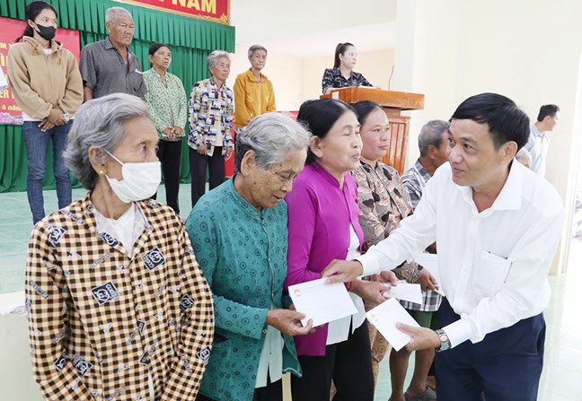 Lãnh đạo Ủy ban MTTQ Việt Nam tỉnh và UBND xã Đại An tặng quà nhân dịp Tết cổ truyền Chôl Chnăm Thmây cho người dân Khmer xã Đại An