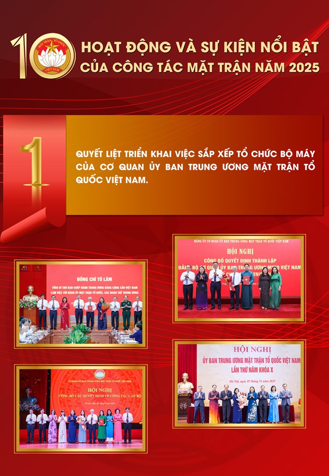 Trong bối cảnh sắp xếp tổ chức bộ máy, khối lượng công việc lớn, bám sát sự lãnh đạo của Đảng, chính sách pháp luật của Nhà nước và thực hiện 3 quan điểm chỉ đạo và 6 nhiệm vụ trọng tâm đã được Tổng Bí thư Tô Lâm nhấn mạnh tại Đại hội đại biểu Đảng bộ Mặt trận Tổ quốc, các đoàn thể Trung ương lần thứ I, Mặt trận Tổ quốc Việt Nam các cấp và các tổ chức chính trị - xã hội đã chủ động, linh hoạt, tập trung triển khai các nhiệm vụ theo chương trình, kế hoạch đã xác định và triển khai hoàn thành tốt các nhiệm vụ đột xuất, phát sinh xuất phát từ yêu cầu thực tiễn, coi trọng thực chất, hiệu quả. Trước những thành công đó, Ban Thường trực Ủy ban Trung ương MTTQ Việt Nam xin giới thiệu 10 hoạt động và sự kiện nổi bật của công tác Mặt trận năm 2025: