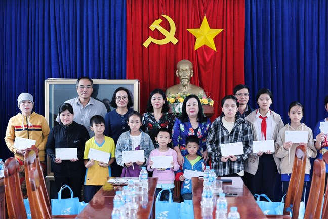| Ủy viên Trung ương Đảng, Phó Chủ tịch Ủy ban Trung ương MTTQ Việt Nam, Chủ tịch Hội LHPN Việt Nam Nguyễn Thị Tuyến (hàng sau, thứ 3 từ trái sang) và lãnh đạo tỉnh Đắk Lắk trao quà hỗ trợ cho các hội viên, phụ nữ, trẻ mồ côi có hoàn cảnh khó khăn bị ảnh hưởng bởi bão lũ vừa qua tại phường Hoà Thịnh |