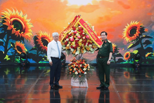 | Ông Đỗ Văn Chiến, Ủy viên Bộ Chính trị, Bí thư Trung ương Đảng, Bí thư Đảng ủy MTTQ, các đoàn thể Trung ương, Chủ tịch UBTƯ MTTQ Việt Nam tặng hoa chúc mừng chương trình. Ảnh: Tiến Đạt |