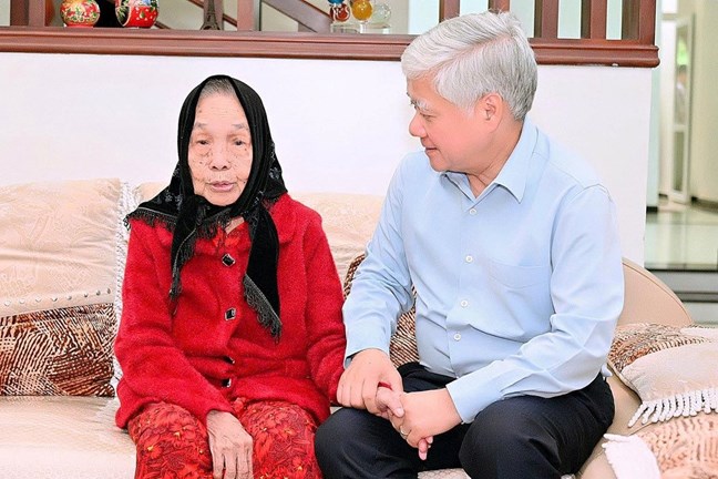 | Chủ tịch Ủy ban Trung ương Mặt trận Tổ quốc Việt Nam Đỗ Văn Chiến thăm hỏi sức khỏe Mẹ Việt Nam Anh hùng Lê Thị Thọ. Ảnh: Đ.T |