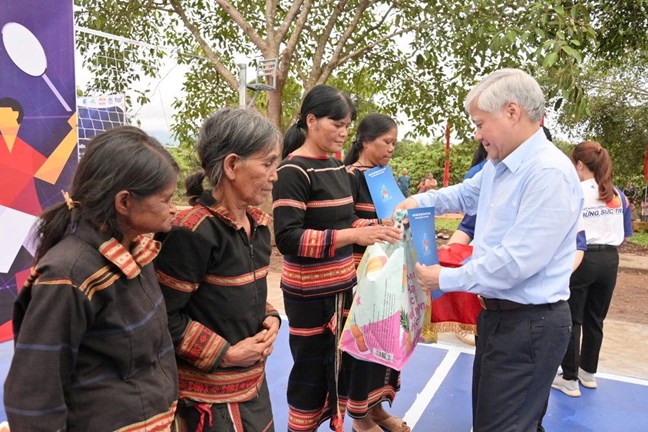 | Chủ tịch Ủy ban Trung ương Mặt trận Tổ quốc Việt Nam Đỗ Văn Chiến tặng quà cho người dân có hoàn cảnh khó khăn của xã Ia Ka. Ảnh: Đ.T |