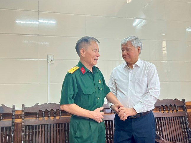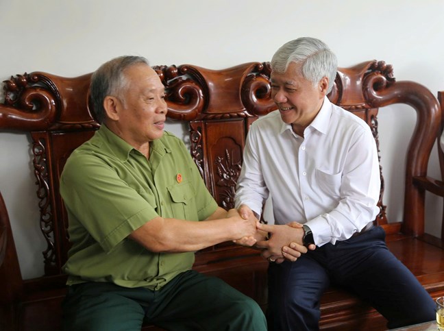 | Chủ tịch Đỗ Văn Chiến trò chuyện, biểu dương tinh thần gương mẫu của thương binh Lưu Trung Sinh (SN 1950, tổ Lê Duẩn 1, phường Kiến An, TP Hải Phòng). |