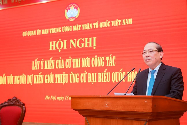 (Mặt trận) - Ngày 13/1, tại Hà Nội, Cơ quan Ủy ban Trung ương MTTQ Việt Nam tổ chức Hội nghị lấy ý kiến của cử tri nơi công tác đối với người dự kiến giới thiệu ứng cử đại biểu Quốc hội khóa XVI. Ông Nguyễn Phi Long, Ủy viên dự khuyết Trung ương Đảng, Phó Bí thư Đảng ủy MTTQ, các đoàn thể Trung ương chủ trì Hội nghị.